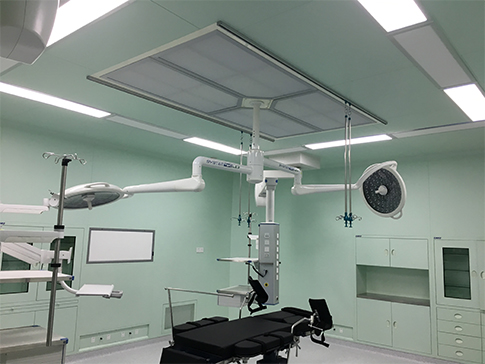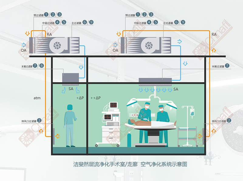 球盟会CHINAFIL“洁净医疗系统净化解决方案”在手术室净化中主要采用垂直层流式净化通风模式(Supply air ceiling for operating theatre),在空调/通风系统前端设置有多级空气预过滤(如图❶❷❸❹❺❻❾),并将无隔板高效过滤器设置在手术台正上方(❼),过滤后的洁净空气通过均流膜以均匀的流速向预设的方向输送,且保持微正压,持续确保手术台达到相应的洁净要求,排风系统的回风口通常设在墙面的四角。此外,在通往手术室的走廊也设置有相应级别的空气过滤器(❼❽),以保证手术室的洁净。