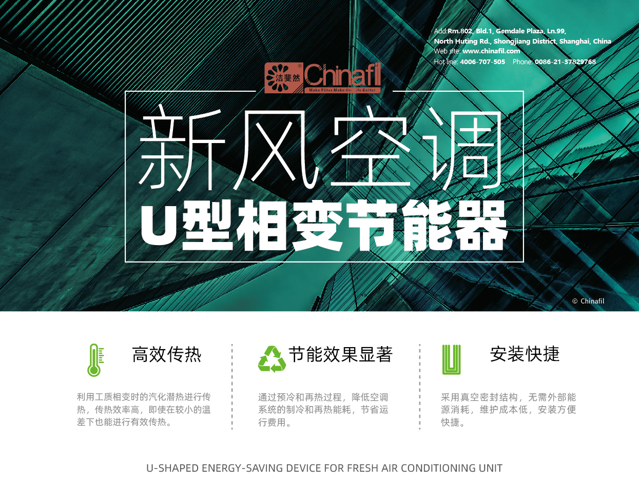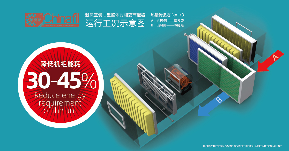 球盟会新风空调专用U型节能器,它采用相变传热技术,通过两组换热器分别位于表冷前后,在热季实现高效的热量传递和节能效果。以10000CMH新风空调为例,热季节能效果:当新风空调为电再热形式时,一个完整热季约可省电50000元;当新风空调再热盘管热源为燃气的时候,一个完整热季约可省电40000元;当新风空调使用蒸汽再热时候,一个完整热季约可省电30000元。