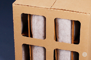,外壳选用高强度硬纸板制作,能满足搬运和工况的需要;箱体内部由两段组成,分别是油雾捕集段和终过滤段;油雾捕集段的作用是捕集绝大部分的油雾,终过滤段是用来拦截剩余的微量油雾;